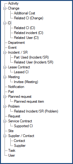 - Search activities with properties from Incidents/SR, Events, Tasks, Problems and Changes nodes