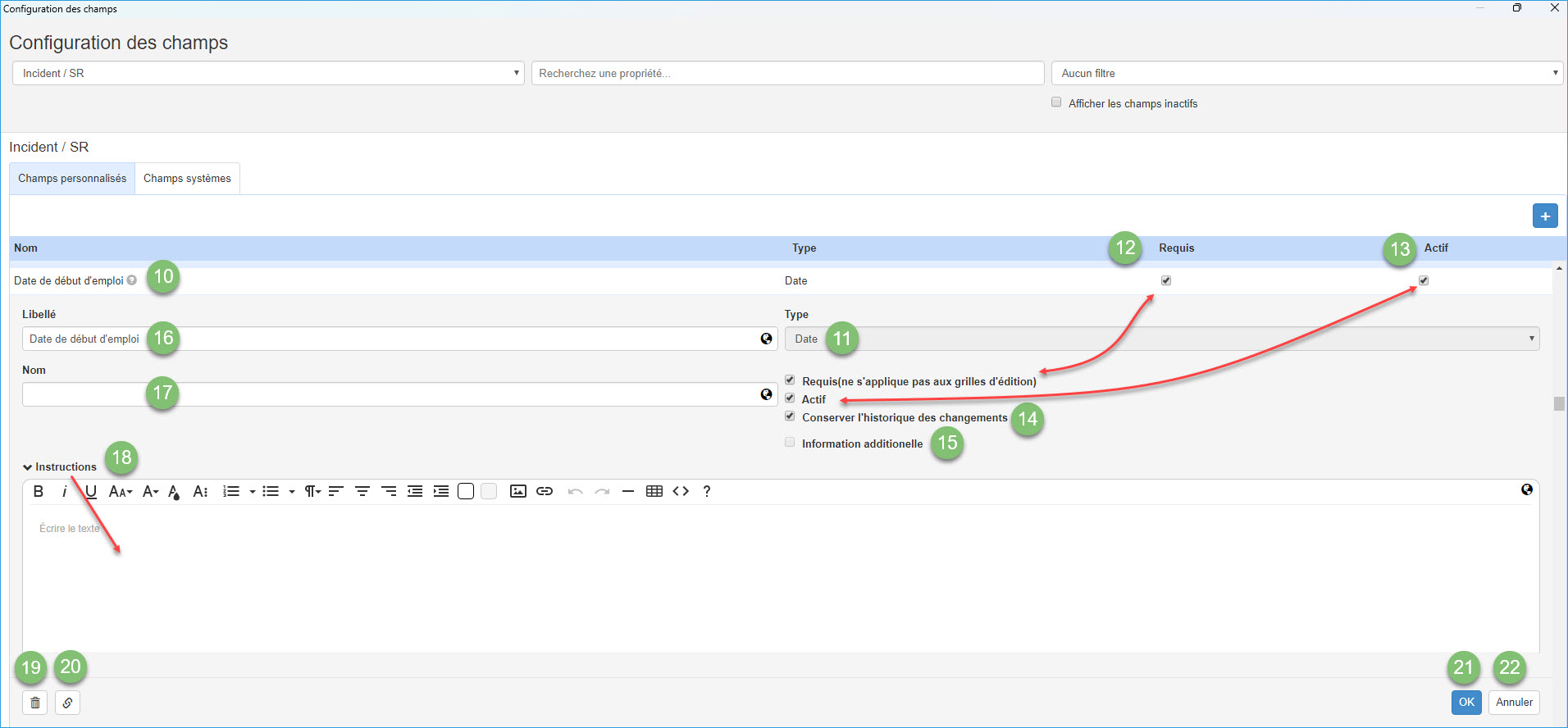 • Requis (ne s'applique pas aux grilles d'édition) signifie que les champs spécialisés créés comme étant des "Informations additionnelles" ne peuvent pas être marqués comme étant requis.